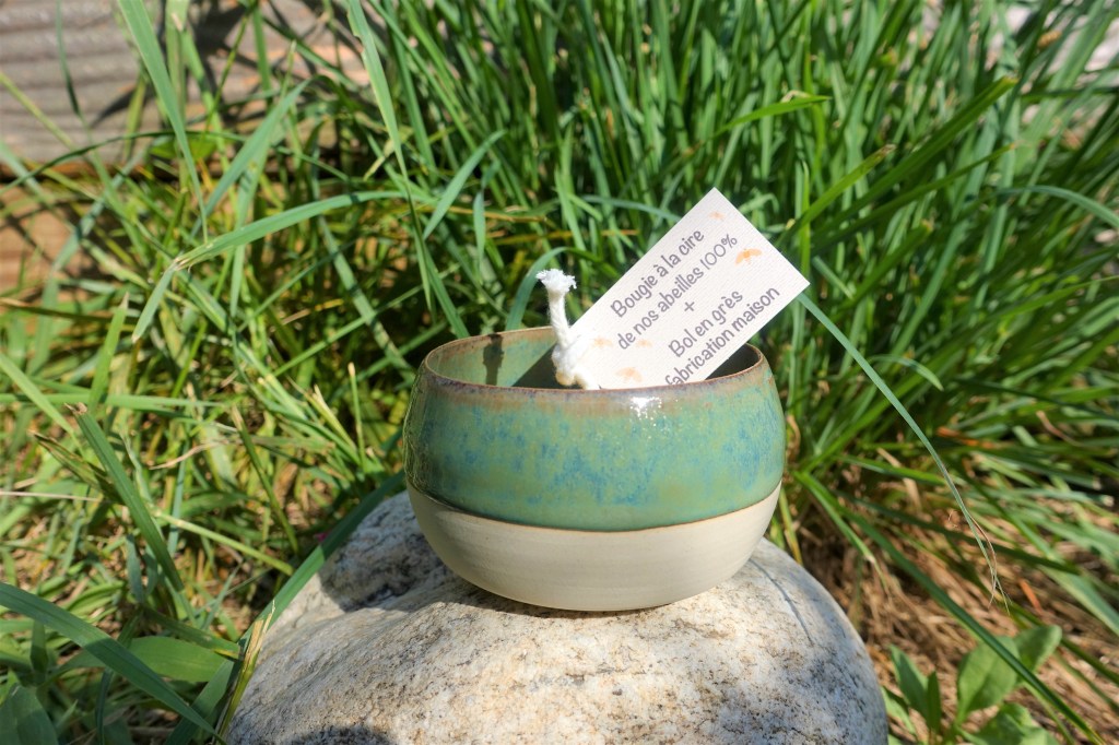 Nos bougies à la cire de nos abeilles sont coulées dans des céramique en grès fabriquées à la miellerie.