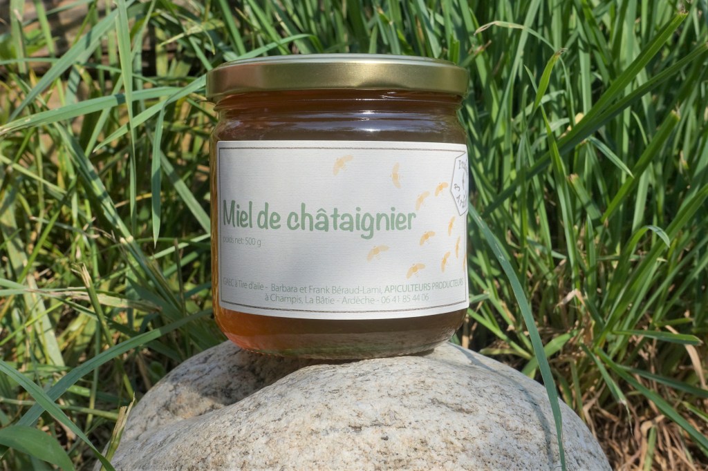 Notre miel de châtaignier est récolté en Ardèche sur nos ruchers situés aux alentours de la miellerie.